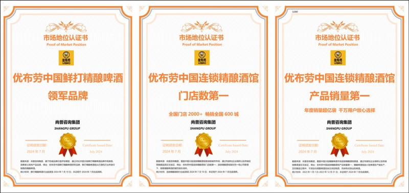 凭借在精酿行业的打拼精神,以及专业实力,2024年7月,优布劳荣获了尚普集团颁发的“中国鲜打精酿啤酒领军品牌”、“中国连锁精酿酒馆产品销量第一”,以及“中国连锁精酿酒馆门店数第一”三项称号。