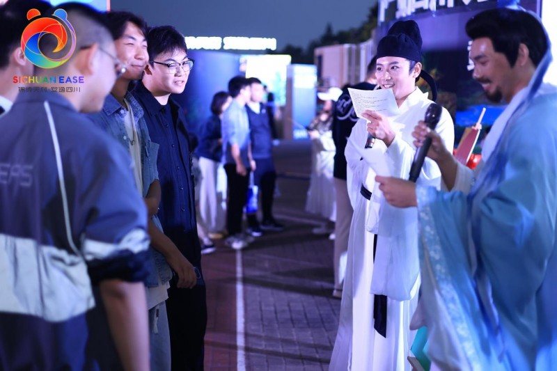 此次来到湖南,四川精心准备了多重好礼:茶艺师手持长嘴壶,壶嘴起落间茶汤飞溅却滴水不洒,引来阵阵喝彩;糖画艺人手腕轻转,绘出熊猫、三星堆青铜面具等造型的糖人儿,独具魅力;“王昌龄与李白千年友谊重聚潇湘”情景演绎;还有身着诸葛亮、李白等巴蜀历史名人服饰的NPC穿梭其间,与市民展开“飞花令”对决,“蜀道之难,难于上青天”“秋风万里芙蓉国”等诗句诗意氤氲;“黑白大竞猜”互动区人气高涨,参与者从数十张熊猫美照中辨认“网红”熊猫……在非遗和文创展示区,蜀锦手链、藏羌彝民族风情盲盒、攀芒芒手办、蜀道锦书杜邦袋等充满蜀韵的趣味文创,吸引了大批游客驻足观赏。