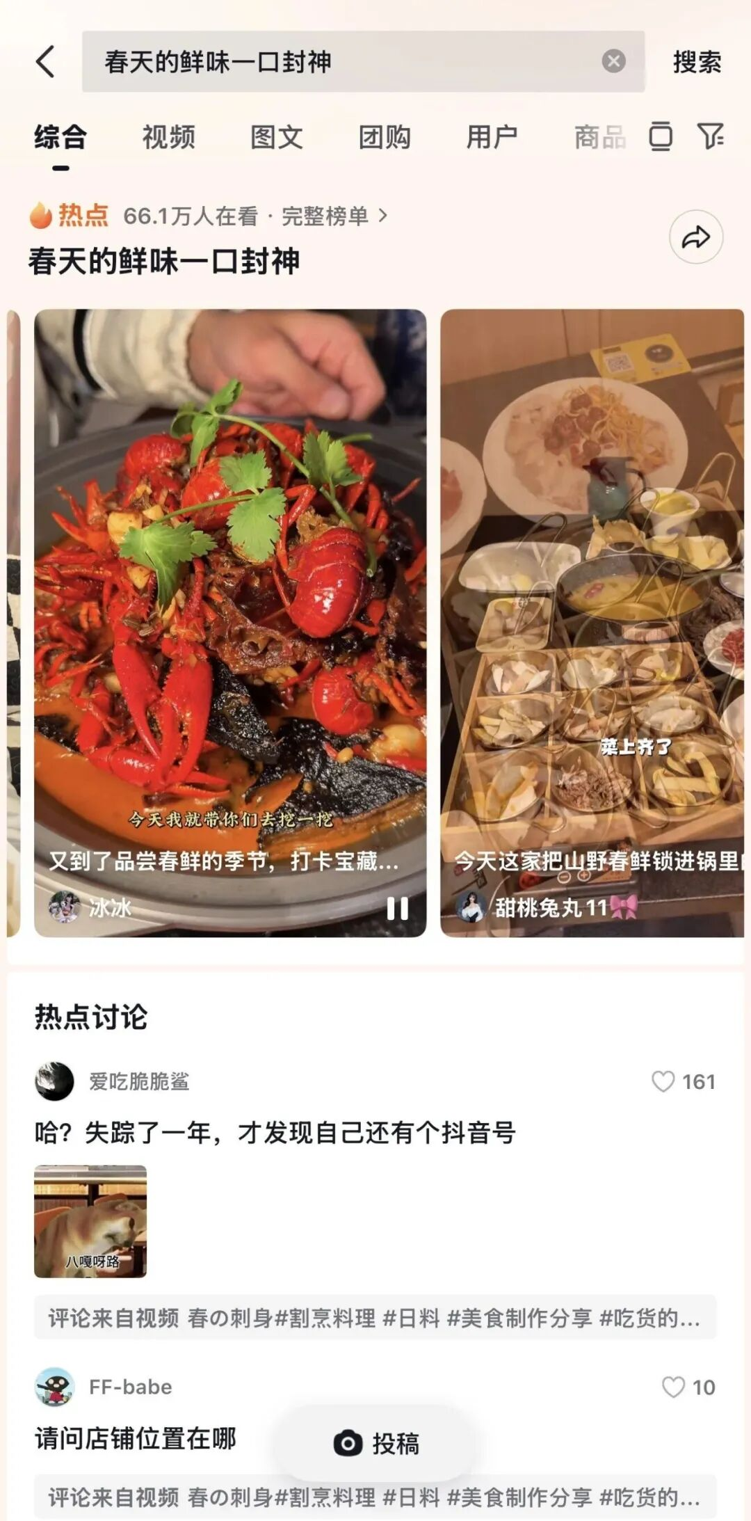 线上种草,线下拔草。千万次的曝光,转化为实实在在的排队人潮。被视频馋哭的食客们,循着香味蜂拥而至,亲口品尝那一口封神的鲜美。在抖音生活的助力下,商家不再只是一家餐厅,而是城市春天的味觉地标。