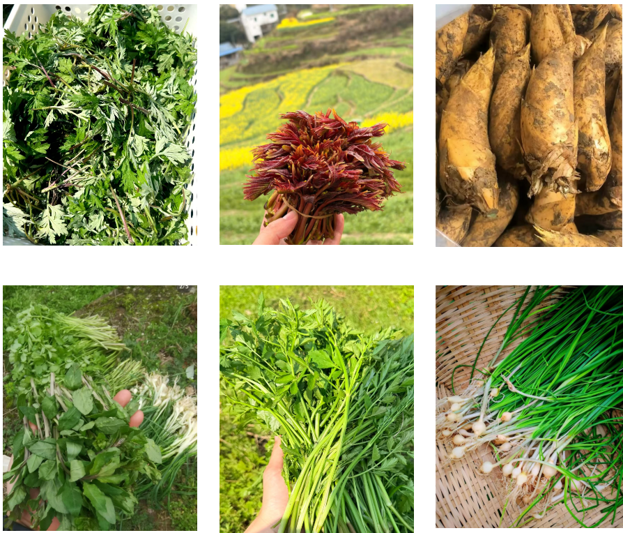 春笋、荠菜、艾蒿、野葱、野芹菜、蕨菜、香椿……